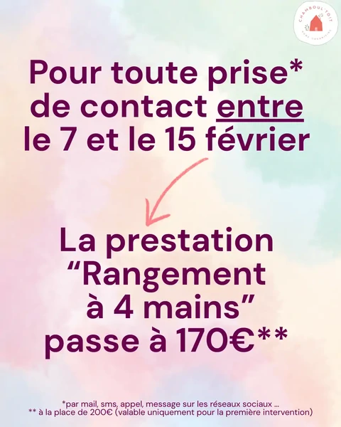 Pour toute prise de contact entre le 07 et le 15 février, la prestation “Rangement à 4 mains” passe à 170€.C'est le moment idéal pour faire de la place chez vous, sans faire exploser votre budget !